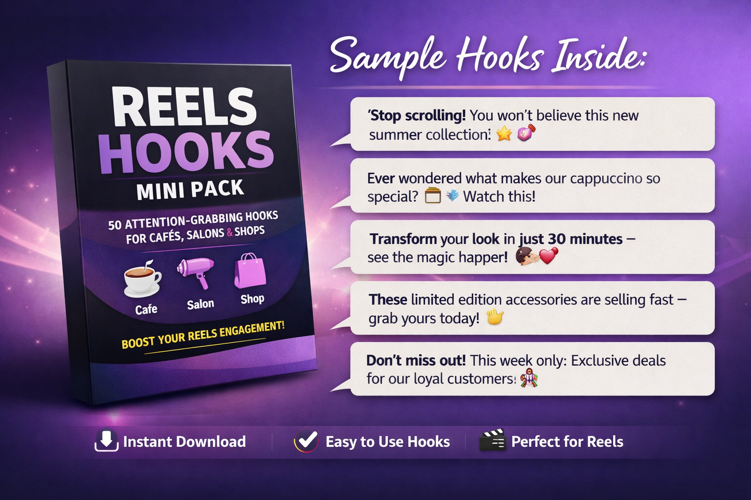 50 ready-to-use Reels hooks designed for cafés, salons, and shops. Boost engagement and grab attention in your Instagram and Facebook Reels instantly.